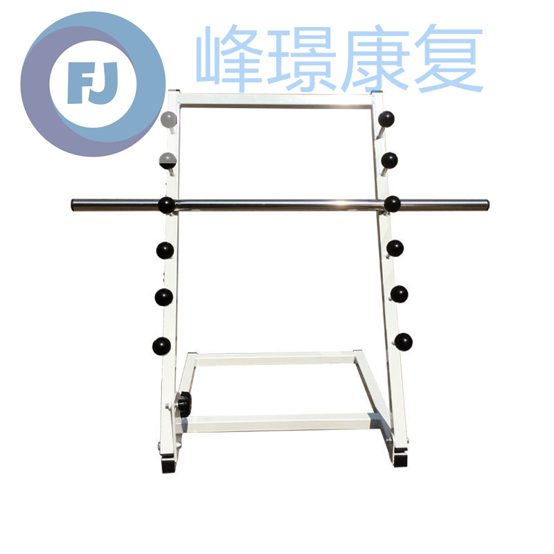 功能介绍:通过将棍棒置放于不同高度训练上肢抬举功能。可在棍棒两端悬挂沙袋,以增加抗阻力。搁架角度可调,放在桌上使用。